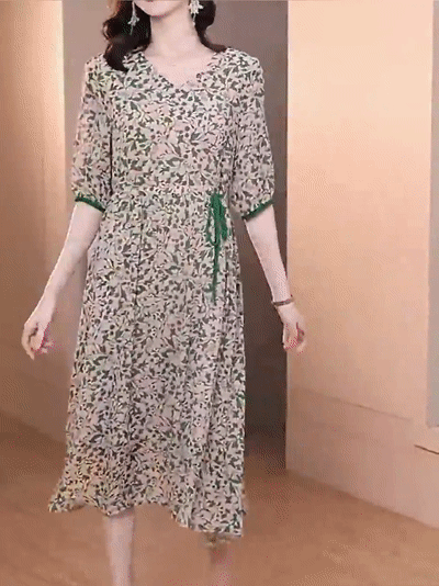 프린트 슬리밍 5부 소매 원피스